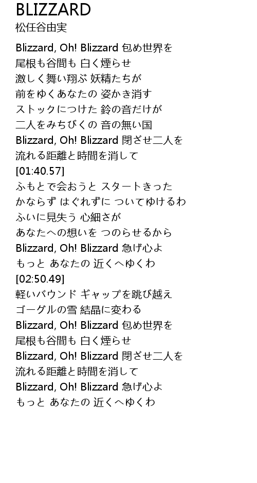 | [02:31.83] | Blizzard, Oh! Blizzard 急げ心よ |