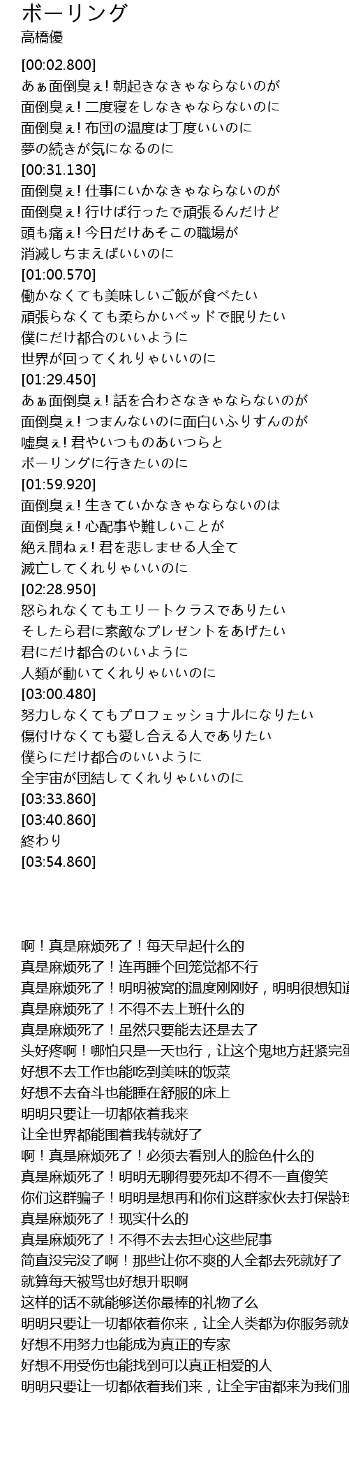 | [00:17.820] | 面倒臭ぇ! 布団の温度は丁度いいのに 夢の続きが気になるのに |