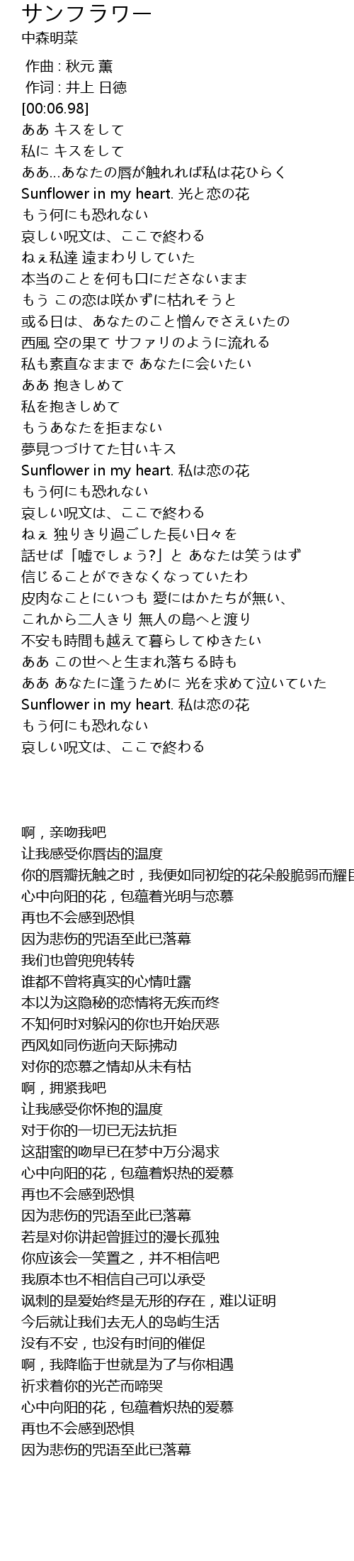 | [00:32.01] | Sunflower in my heart. 光と恋の花 |