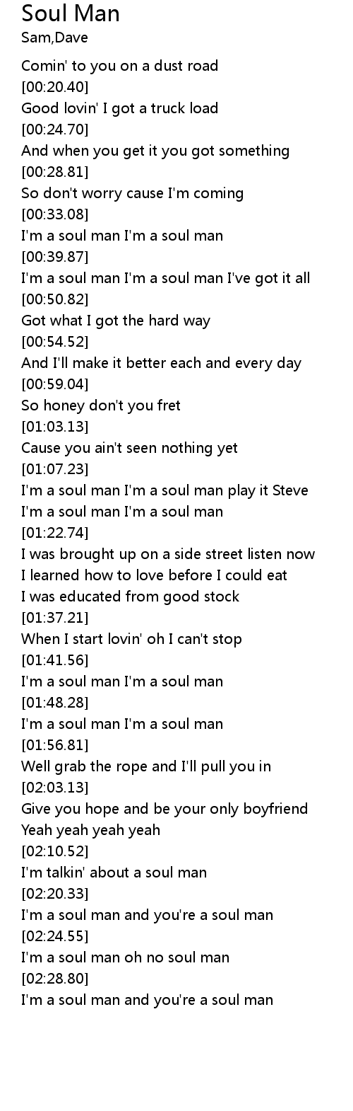 | [00:34.24] | I'm a soul man I'm a soul man |