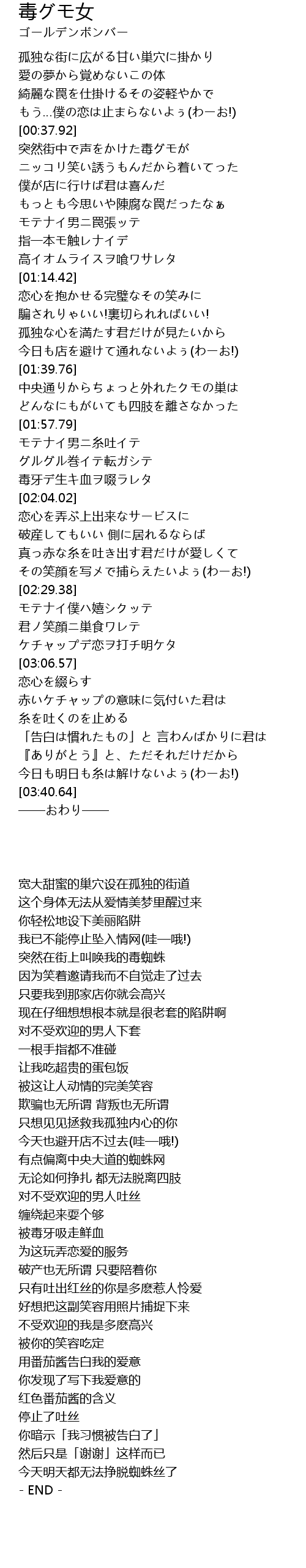 | [00:44.08] | 突然街中で声をかけた毒グモが |