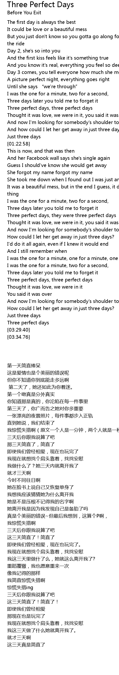 | [00:58.34] | Three perfect days, three perfect days |