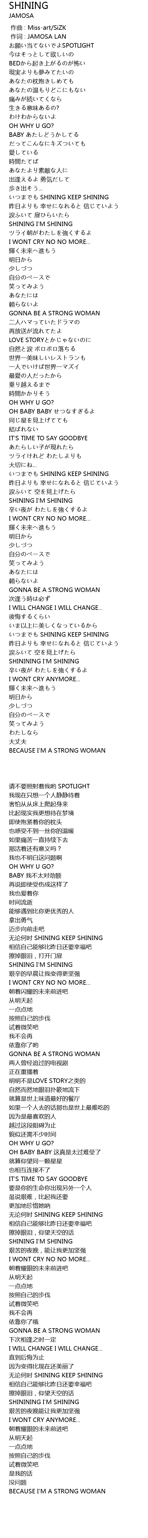 | [03:52.460] | 无论何时 SHINING KEEP SHINING |