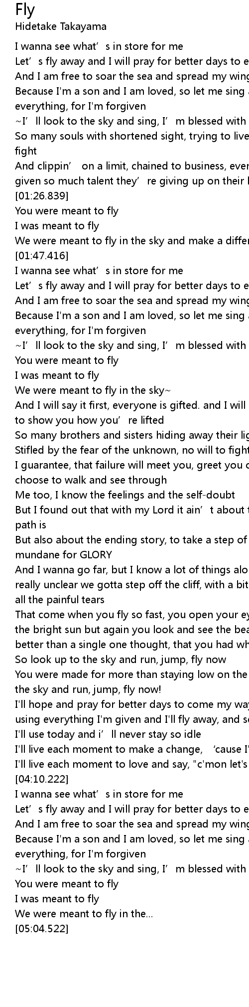 | [03:26.068] | So look up to the sky and run, jump, fly now |