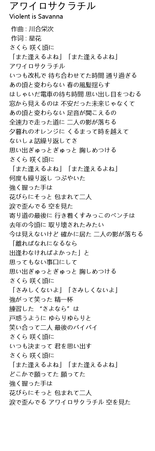 | [05:30.77] | 涙で歪んでる アワイロサクラチル 空を見た |