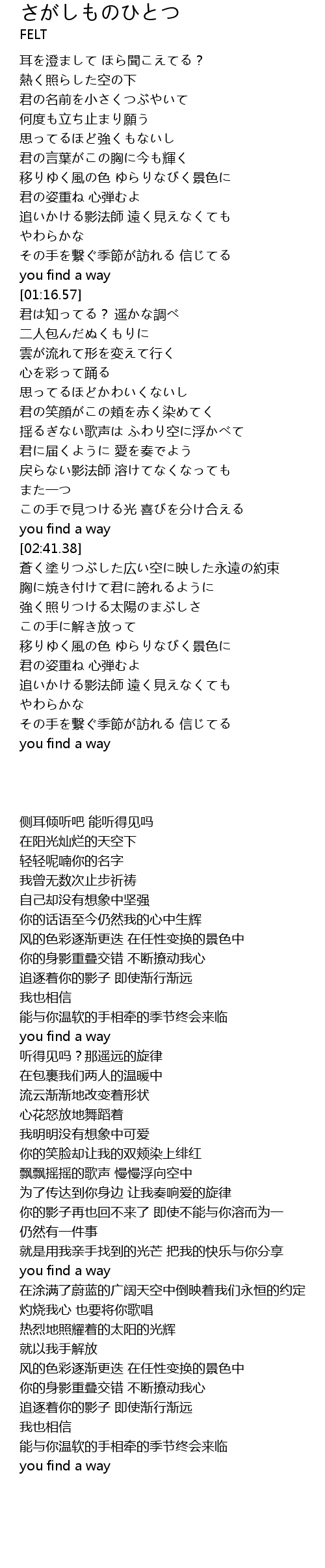 | [02:28.58] | この手で見つける光 喜びを分け合える |