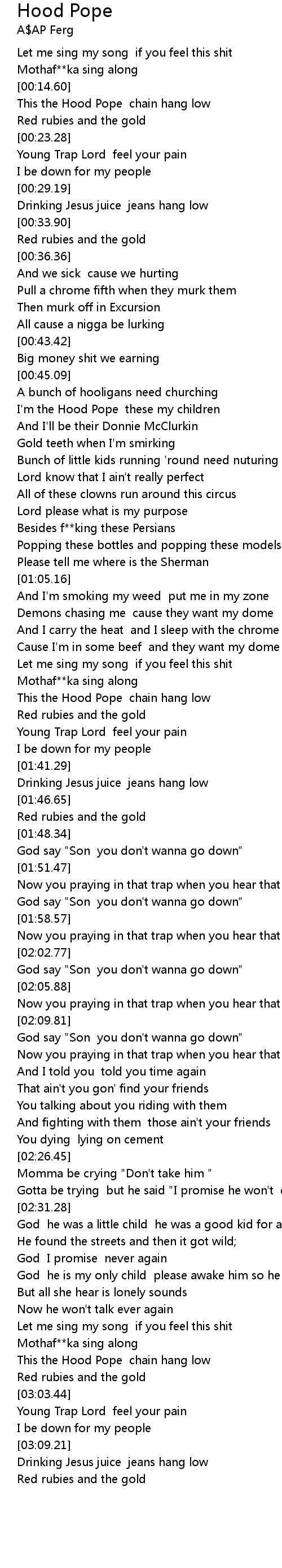 | [01:44.08] | Drinking Jesus juice jeans hang low |