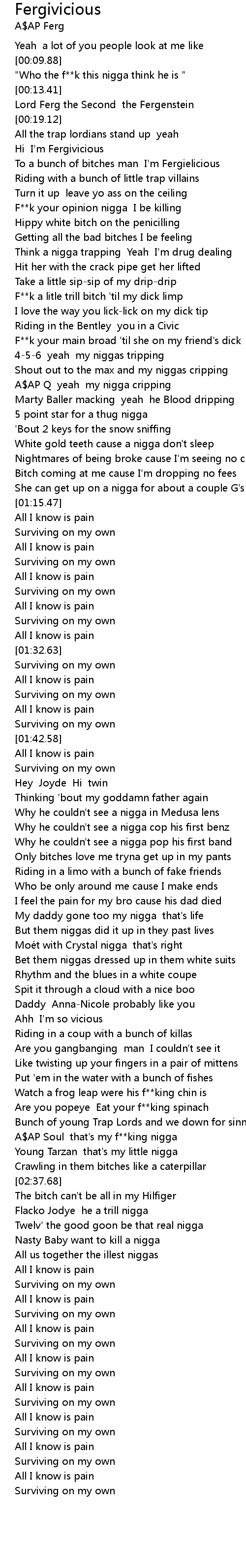 | [00:32.84] | To a bunch of bitches man I'm Fergielicious |