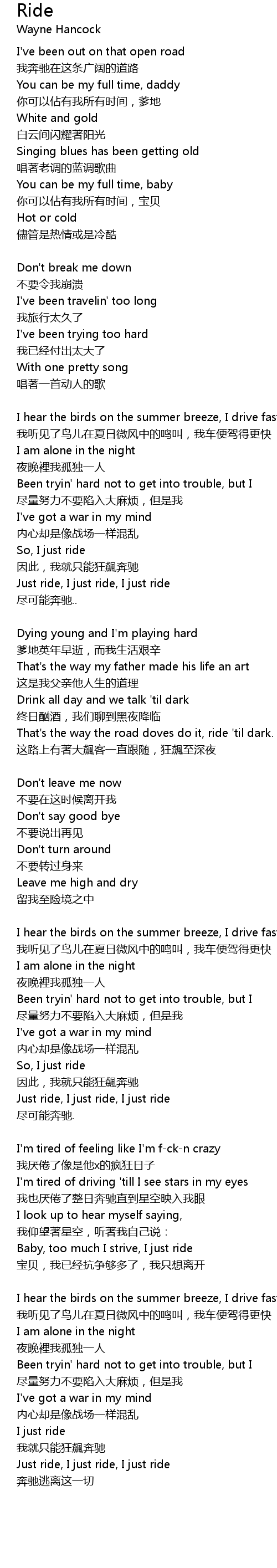 | wǒ tīng jiàn le niǎo ér zài xià rì wēi fēng zhōng de míng jiào, wǒ chē biàn jià dé gèng kuài | |