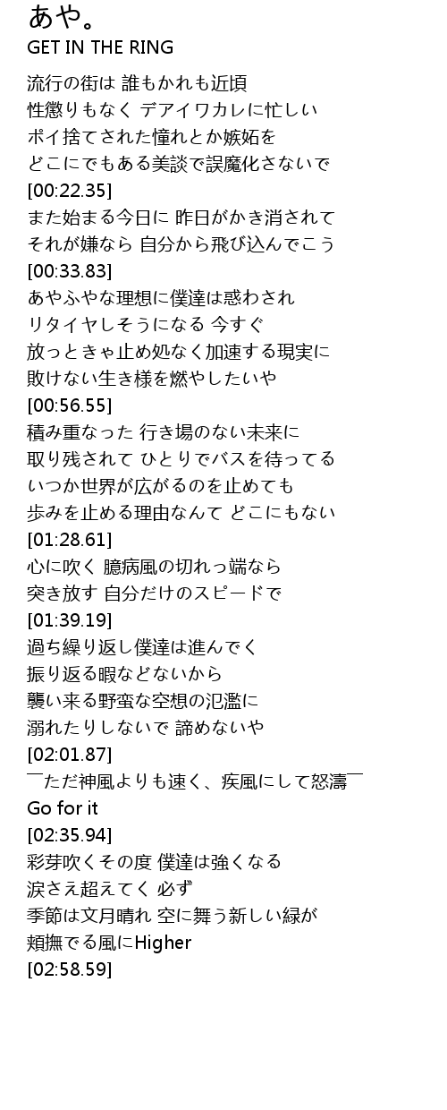 | [01:34.61] | 突き放す 自分だけのスピードで |
