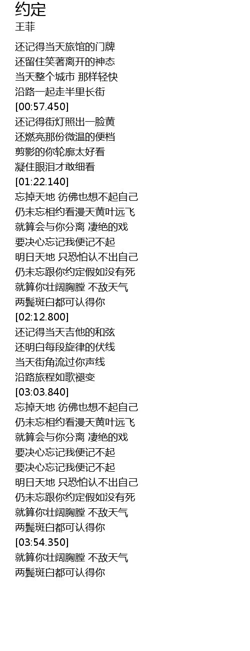 | [01:54.020] | réng wèi wàng gēn nǐ yuē dìng jiǎ rú méi yǒu sǐ |