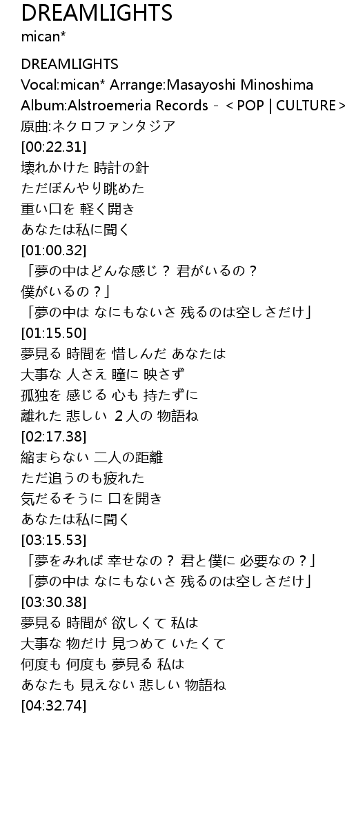 | [00:06.43] | Vocal:mican* Arrange:Masayoshi Minoshima |