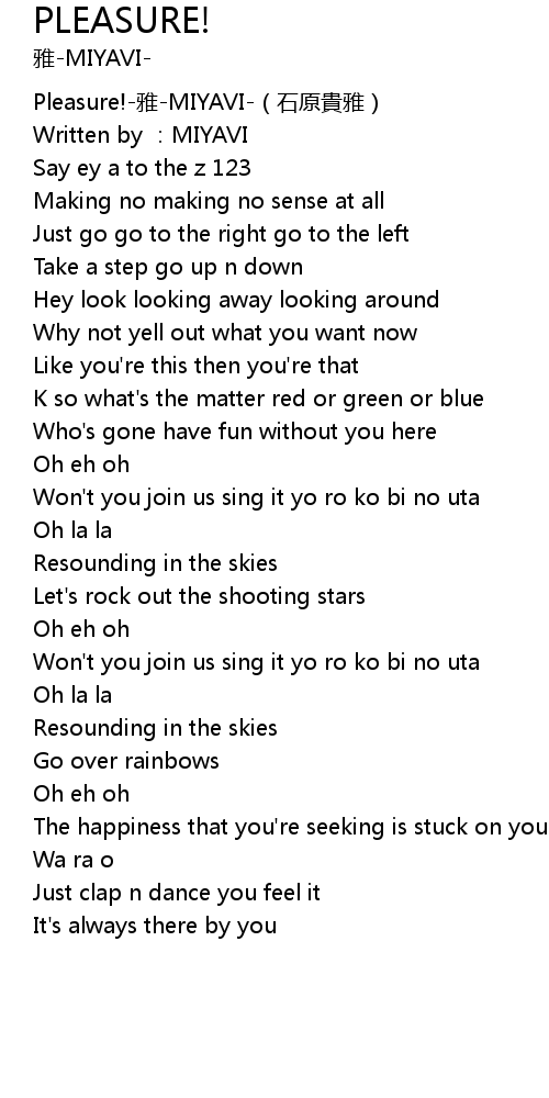 | [00:00.84] | Pleasure! yǎ MIYAVI shí yuán guì yǎ |