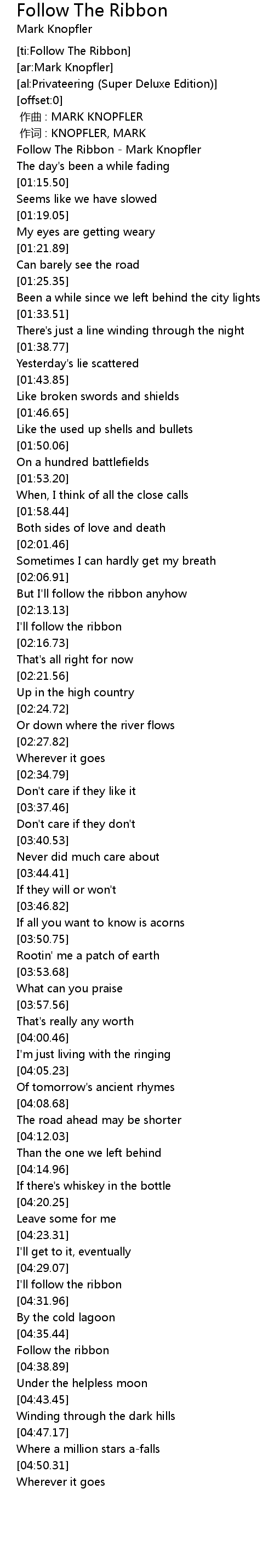 | [00:00.44] | Follow The Ribbon - Mark Knopfler |