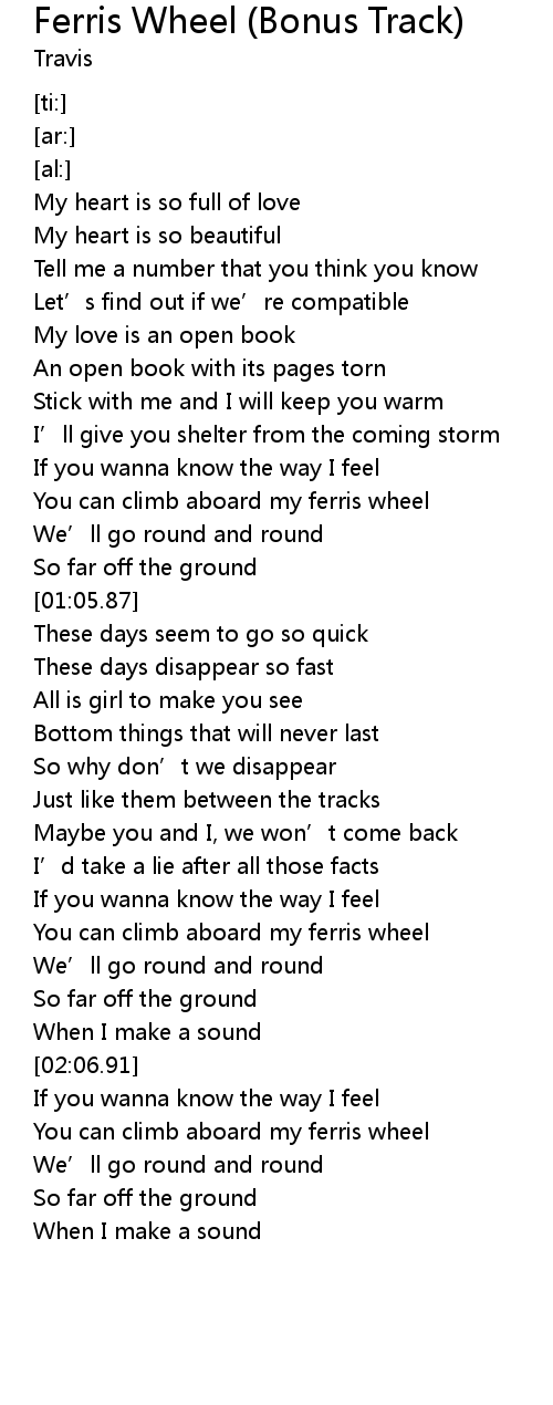 | [00:50.60] | You can climb aboard my ferris wheel |