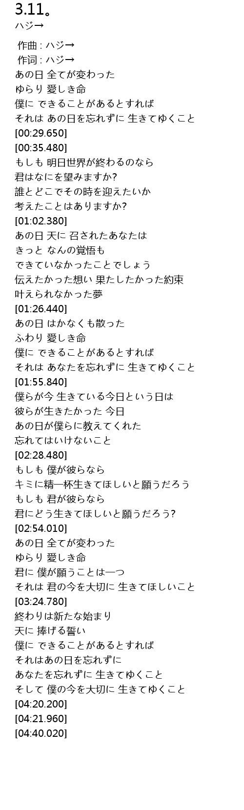 | [04:08.760] | そして 僕の今を大切に 生きてゆくこと |