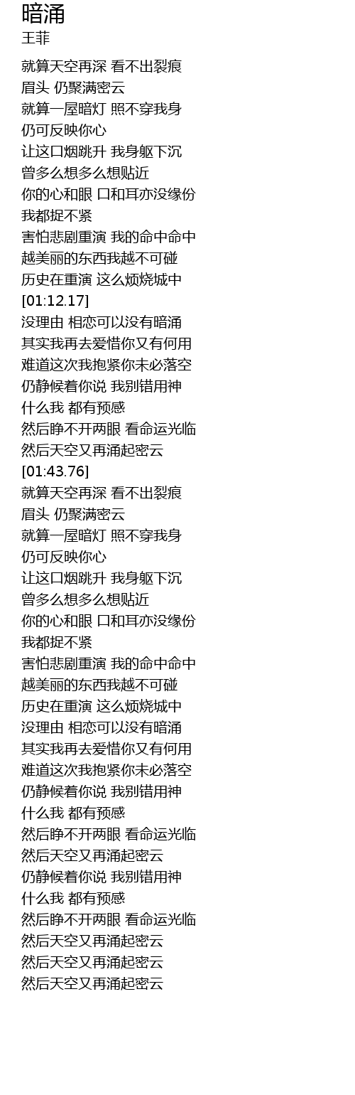 | [01:15.35] | 没理由 相恋可以没有暗涌 |