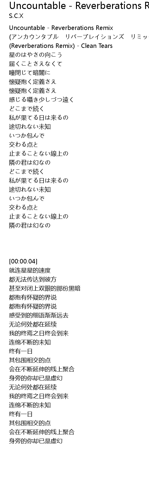 | [00:00.04] | Uncountable Reverberations Remix Reverberations Remix Clean Tears |