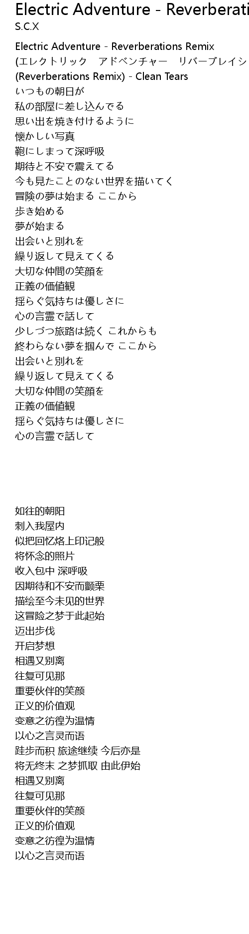 | [00:00.04] | Electric Adventure - Reverberations Remix (エレクトリック アドベンチャー リバーブレイションズ リミックス) (Reverberations Remix) - Clean Tears |