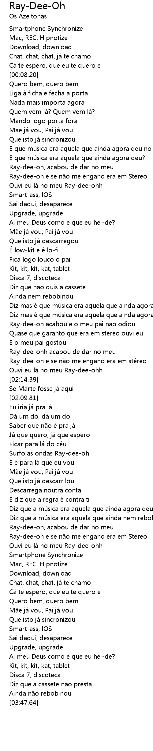 | [03:10.63] | Ouvi eu lá no meu Ray-dee-ohh |
