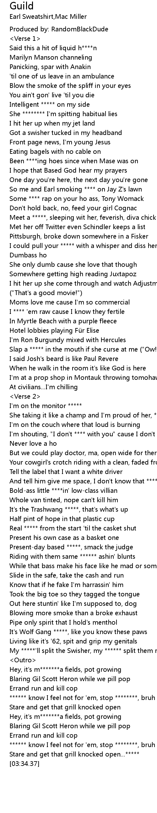 | [00:44.12] | So me and Earl smoking **** on Jay Z's lawn |