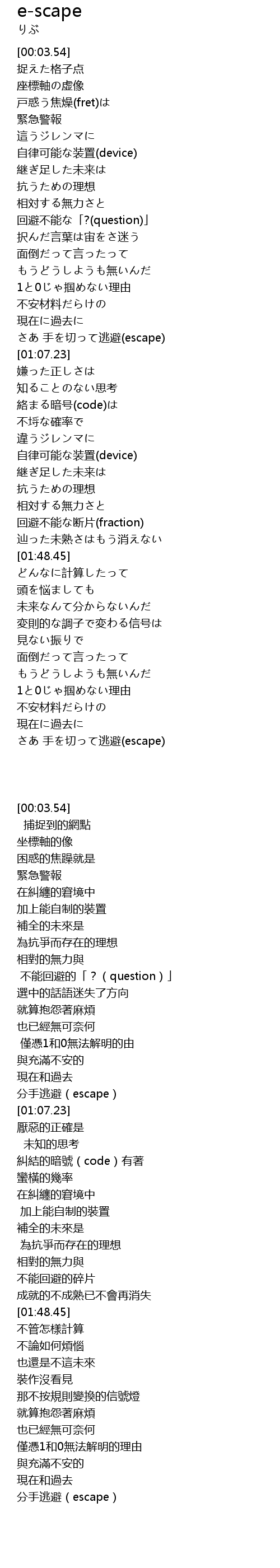 | [01:02.34] | さあ 手を切って逃避(escape) |