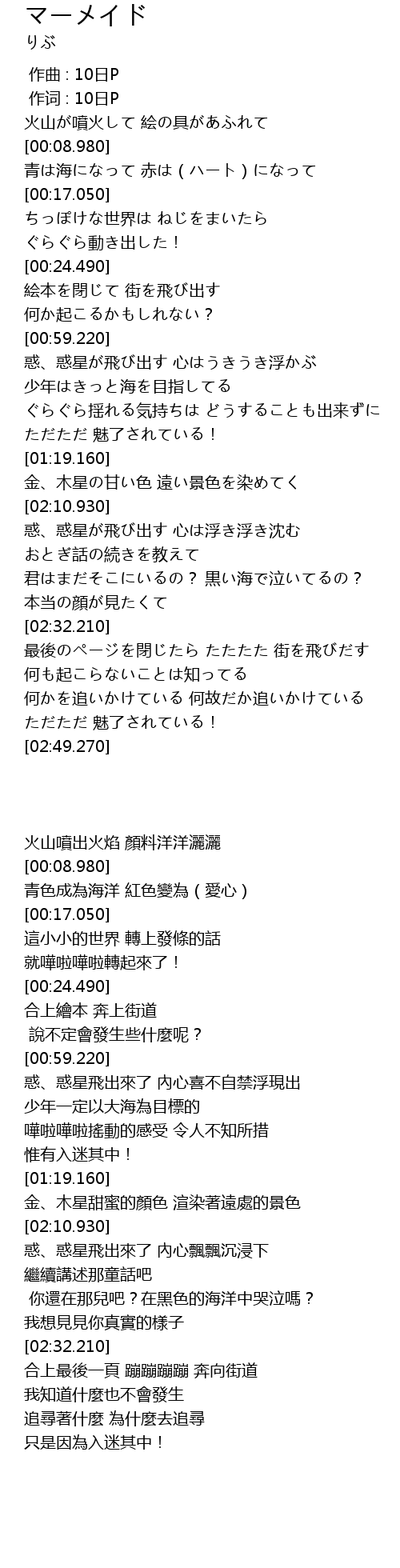 | [00:08.540] | 火山が噴火して 絵の具があふれて |