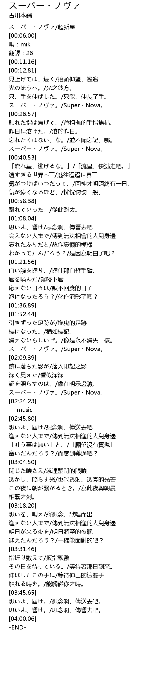| [02:20.67] | スーパー・ノヴァ。/Super・Nova。 |