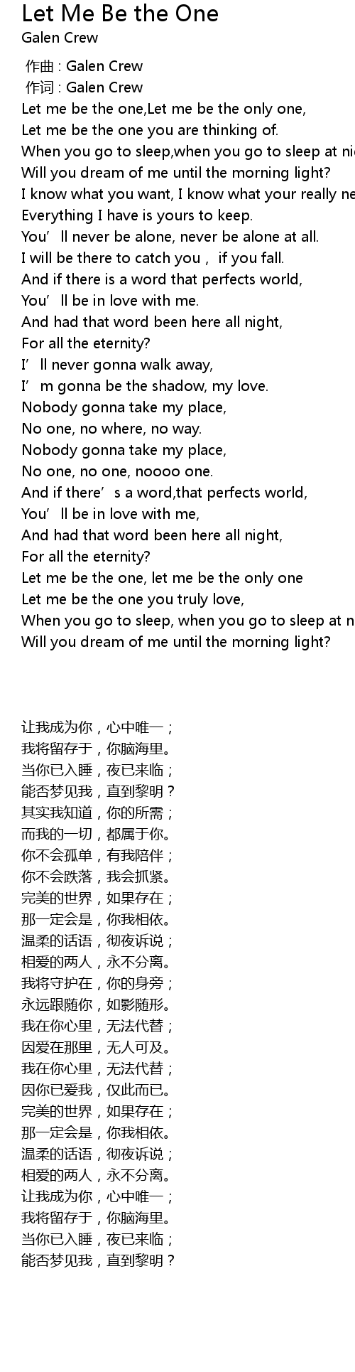 | [02:47.00] | Let me be the one, let me be the only one |