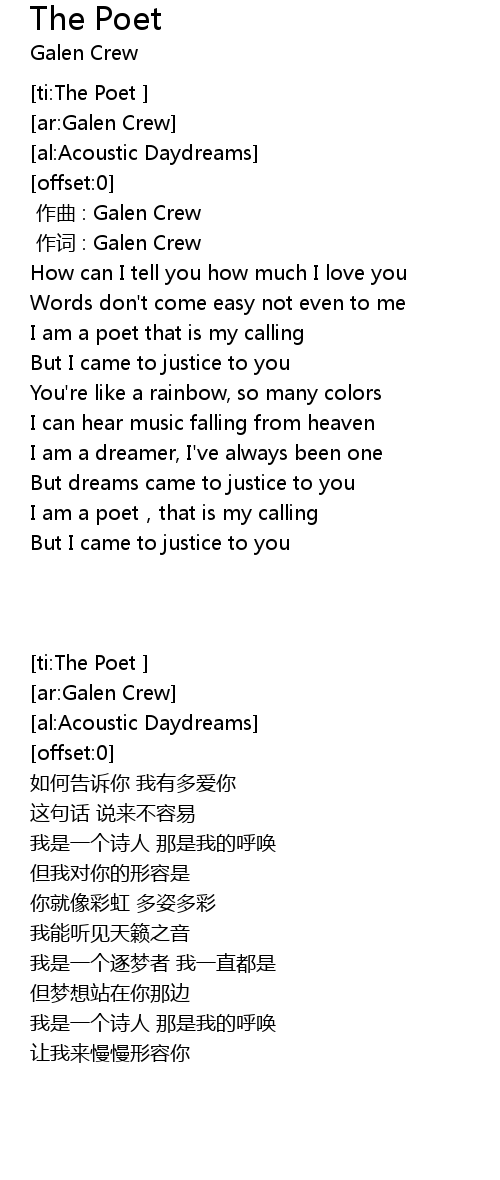 | [00:43.85] | 我是一个诗人 那是我的呼唤 |