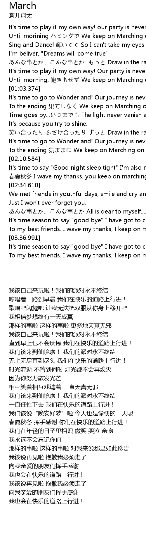 | [03:46.562] | To my best friends. I wave my thanks, I keep on marching on happiness |