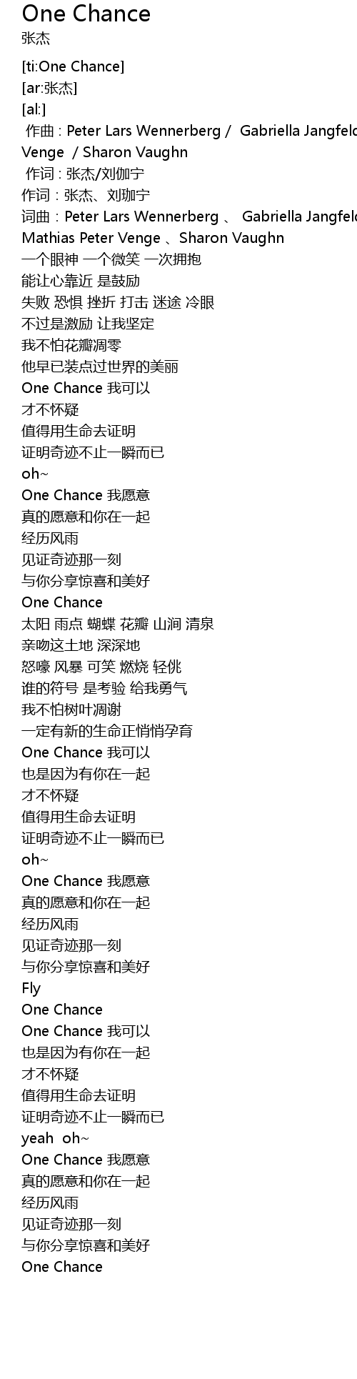 | [03:43.66] | One Chance wǒ yuàn yì |