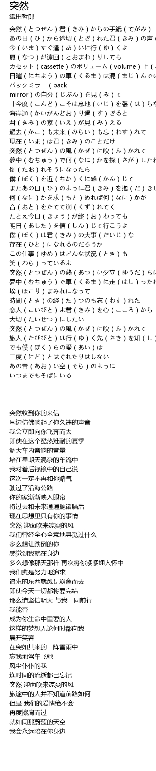 | [00:00.480] | 突然(とつぜん)君(きみ)からの手紙(てがみ) |