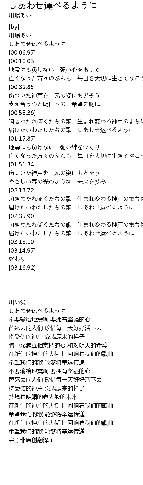 | [02:36.78] | 响きわたれぼくたちの歌 生まれ変わる神戸のまちに |