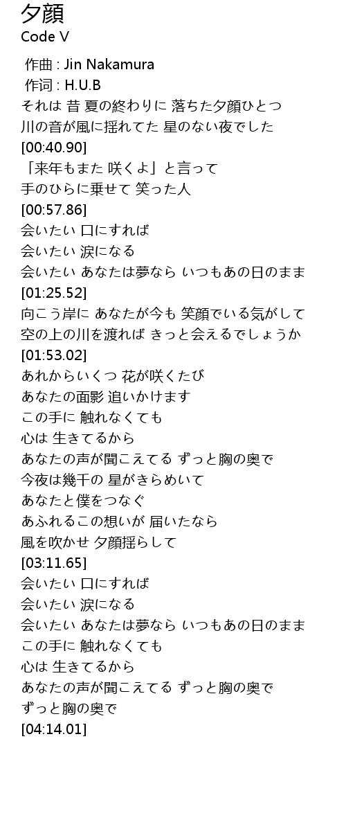 | [00:14.04] | それは 昔 夏の終わりに 落ちた夕顔ひとつ |