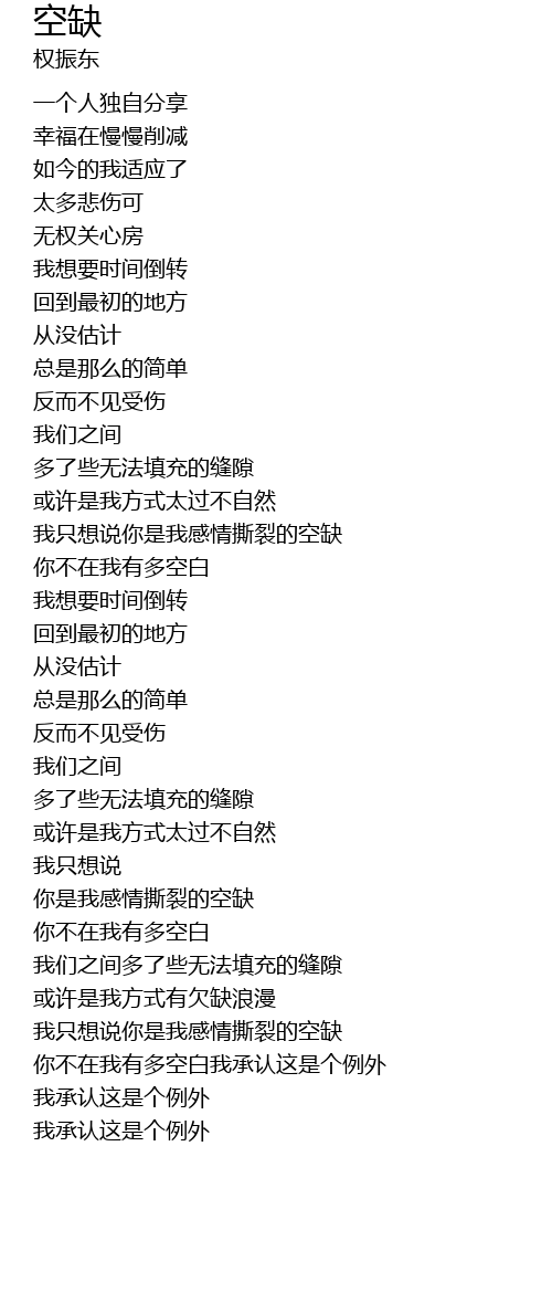 | [03:56.290] | 我只想说你是我感情撕裂的空缺 |