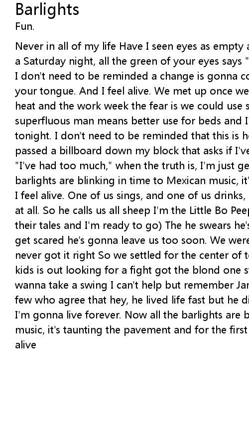 Never in all of my life Have I seen eyes as empty as these streets of my city on a Saturday night, all the green of your eyes says "Go, leave it all behind." But I don't need to be reminded a change is gonna come. I can feel it on the tip of your tongue. And I feel alive. We met up once we'd settled the sun Between the heat and the work week the fear is we could use some sleep but sleep to the superfluous man means better use for beds and I'll bet I'm coming home alone tonight. I don't need to be reminded that this is how it was. I moved on, I passed a billboard down my block that asks if I've had enough, and aloud I say "I've had too much," when the truth is, I'm just getting started. Now all the barlights are blinking in time to Mexican music, it's taunting the pavement and I feel alive. One of us sings, and one of us drinks, and one of us has nothing at all. So he calls us all sheep I'm the Little Bo Peep of the bunch. (I take their tales and I'm ready to go) The he swears he's gotta take this call Man, I get scared he's gonna leave us too soon. We were the get rich quick kids, We never got it right So we settled for the center of town Where all the rich white kids is out looking for a fight got the blond one staring me down. And I really wanna take a swing I can't help but remember James Dean See we are part of the few who agree that hey, he lived life fast but he died. He died. He died. Me, I'm gonna live forever. Now all the barlights are blinking in time to Mexican music, it's taunting the pavement and for the first time in a long time I feel alive |
