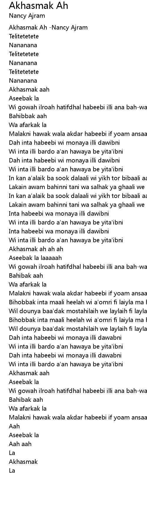 [00:00.281] Akhasmak Ah -Nancy Ajram