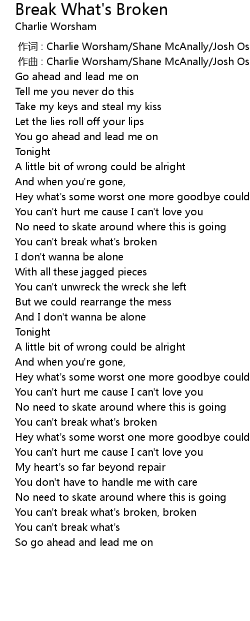 | [00:00.000] | 作词 : Charlie Worsham/Shane McAnally/Josh Osborne |