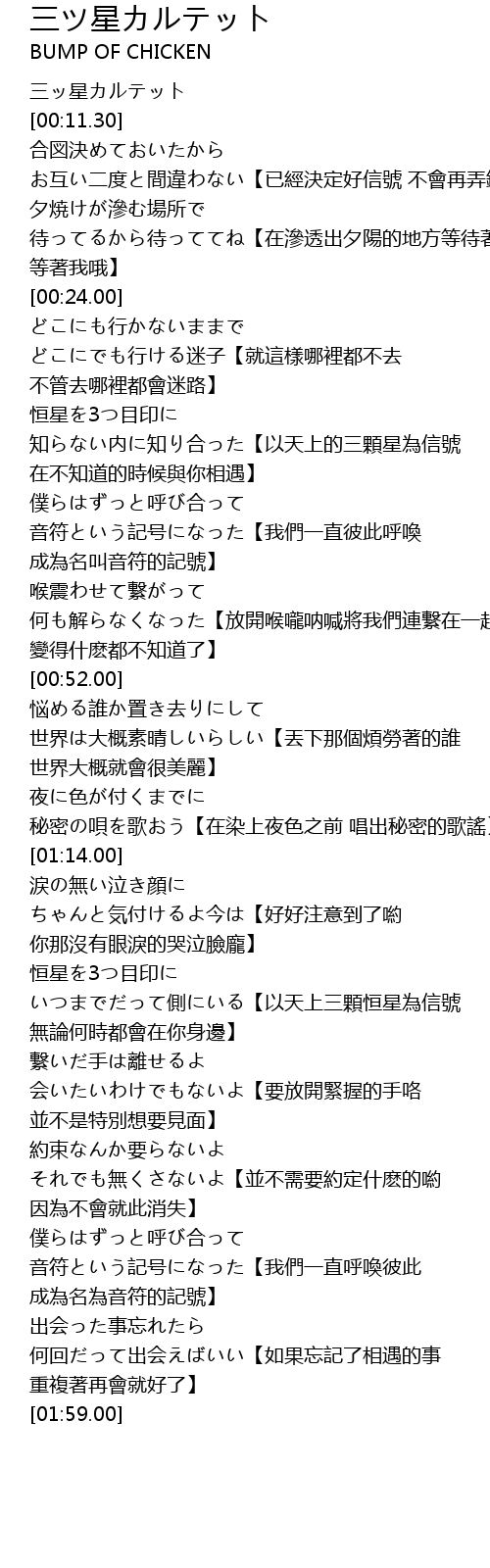 | [00:36.00] | 恒星を3つ目印に 知らない内に知り合った【以天上的三顆星為信號 在不知道的時候與你相遇】 |