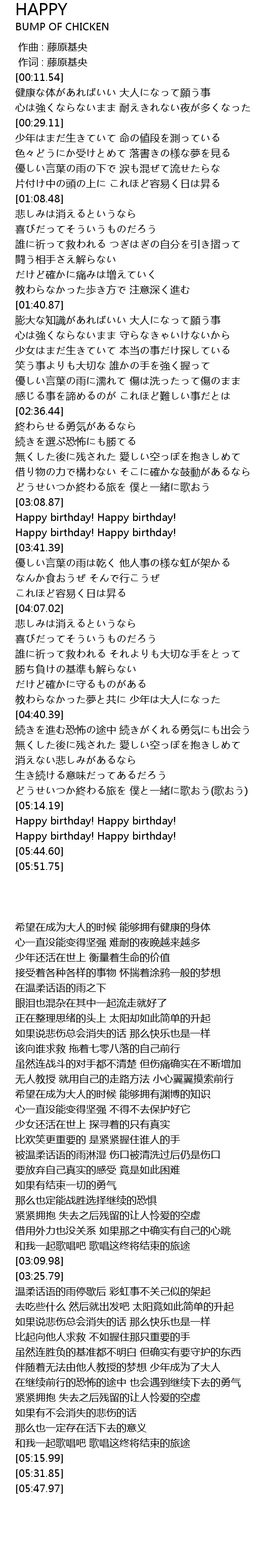 | [03:09.98] | Happy birthday! Happy birthday! |