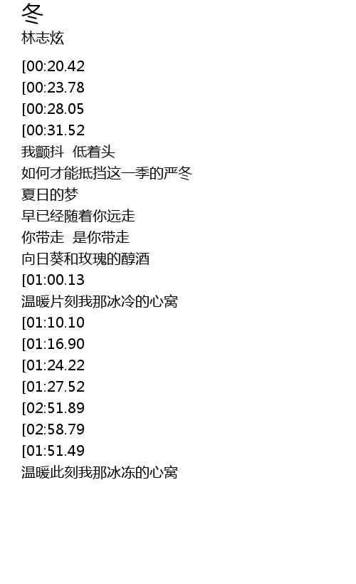 | [02:03.75][00:20.42] | 冬天到来 |