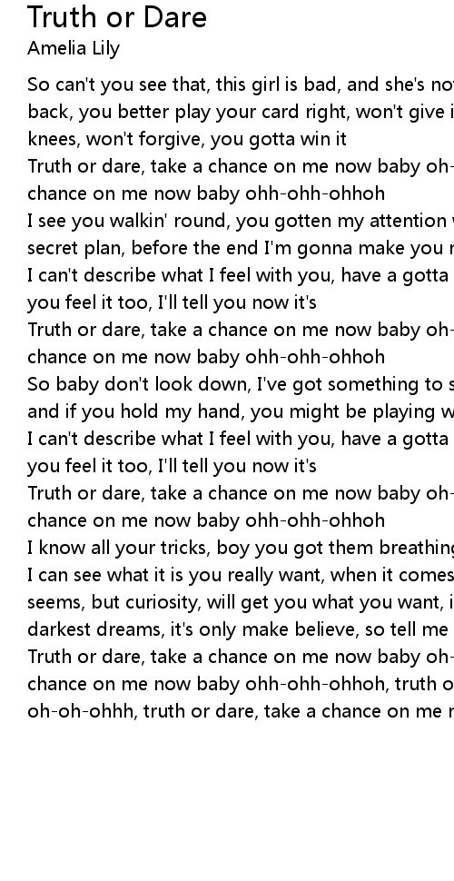 Truth or dare, take a chance on me now baby oh-oh-ohhh, truth or dare, take a chance on me now baby ohh-ohh-ohhoh, truth or dare, take a chance on me now baby oh-oh-ohhh, truth or dare, take a chance on me now baby ohh-ohh-ohhoh |