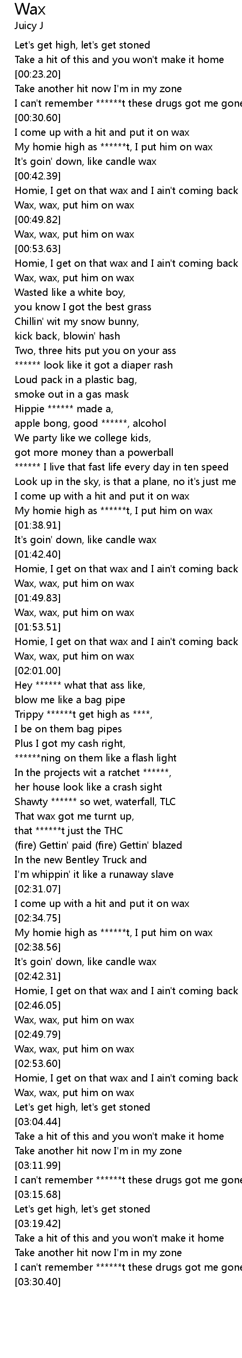 [01:35.04] My homie high as ******t, I put him on wax