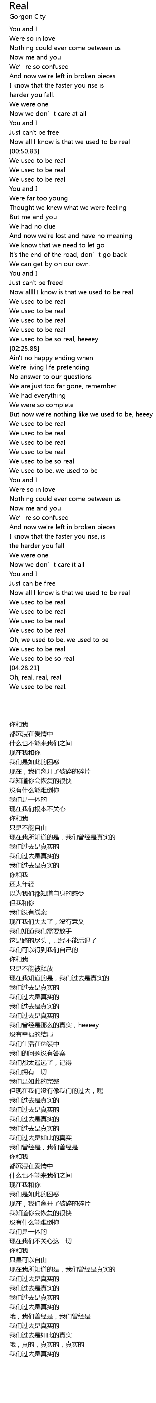 | [00:47.81] | Now all I know is that we used to be real |