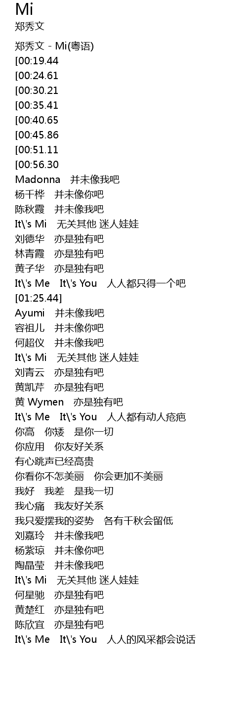 | [00:00.00] | 郑秀文 - Mi(粤语) |
