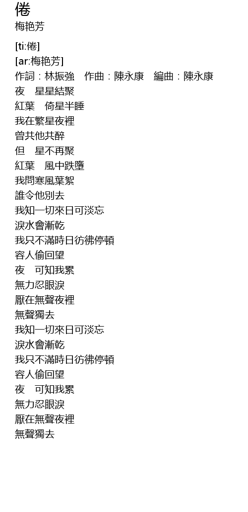 | [00:00.791] | 作詞:林振強 作曲:陳永康 編曲:陳永康 |