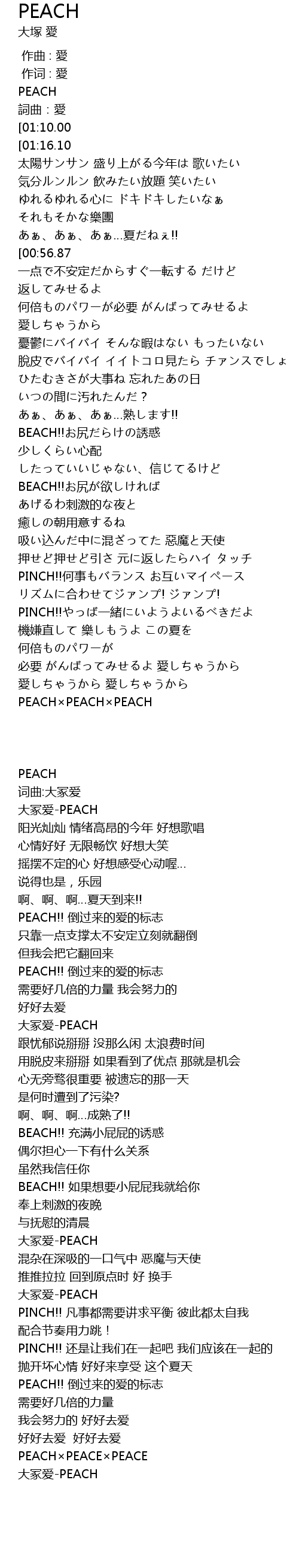 | [00:08.00][01:10.00][02:18.61][02:37.94][03:53.49] | dà zhǒng ài PEACH |