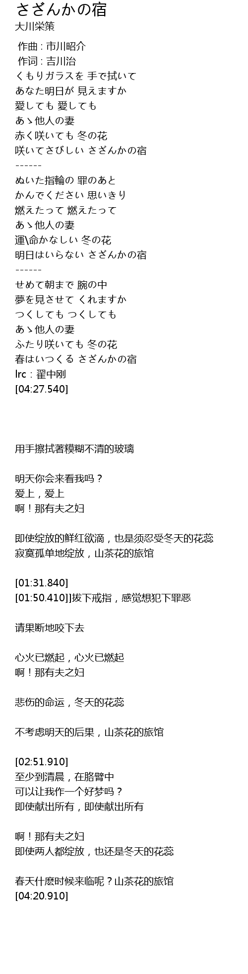 | [01:15.470] | 寂寞孤单地绽放,山茶花的旅馆 |