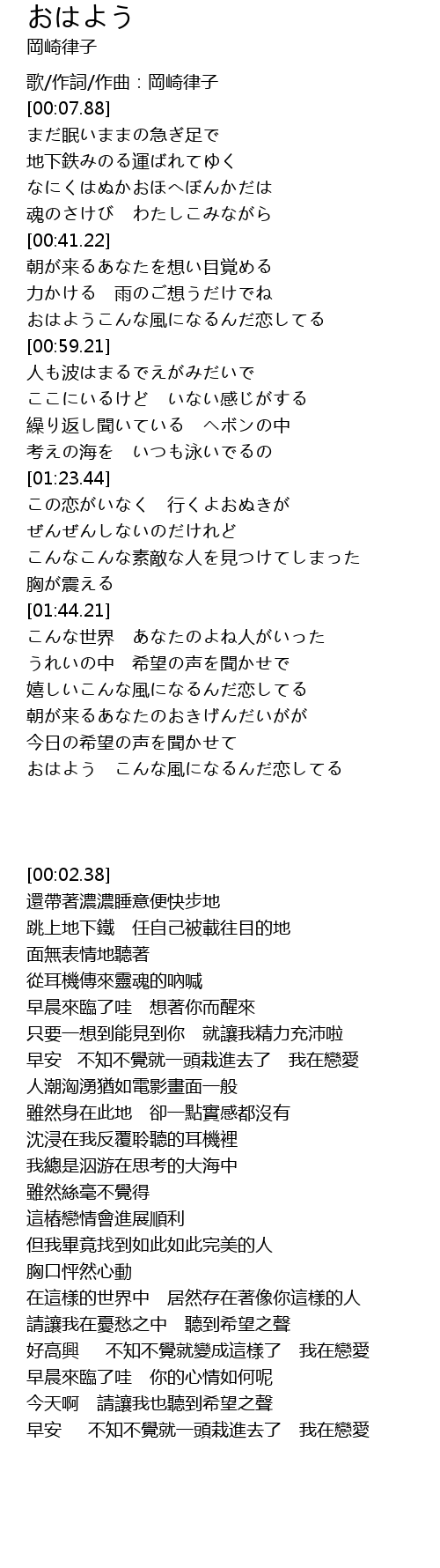 | [00:02.38] | 歌/作詞/作曲:岡崎律子 |